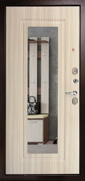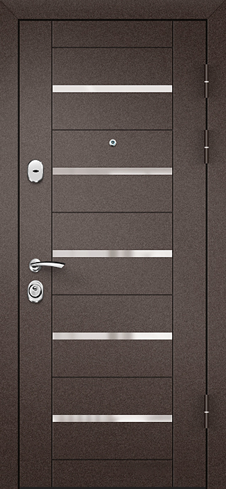 Прочный стальной каркас, лист металла толщиной 2 мм и система блокираторов делают эту модель надежным барьером для квартиры, офиса или частного дома. Внешняя поверхность покрыта молотковым напылением, устойчивым к механическим повреждениям и перепадам температуры, благодаря чему дверь сохраняет аккуратный вид долгие годы. Внутренняя накладка МДФ добавляет уюта и гармонично сочетается с интерьером прихожей. Зеркало на полотне выполняет не только декоративную функцию, но и делает пространство визуально шире. Зеленая входная дверь в квартиру №2 комплектуется двумя замками российских производителей — сувальдным Просам и цилиндровым Мосрентген, каждый из которых оснащён тремя ригелями. Два контура резинового уплотнения помогают минимизировать сквозняки и шум, а возможность выбрать сторону и тип открывания делает установку максимально удобной. При необходимости отделку, замки и дополнительные элементы можно адаптировать под индивидуальные требования. Зеленая входная дверь в квартиру №2 от производителя: быстрое изготовление и монтаж в Лосино - Петровском, индивидуальные размеры, широкий выбор материалов и фурнитуры, официальная гарантия до 10 лет.