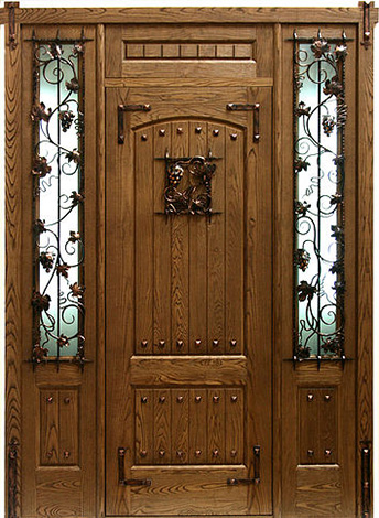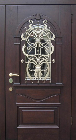Дизайнерская входная дверь в частный дом с отделкой под дерево и решеткой №17