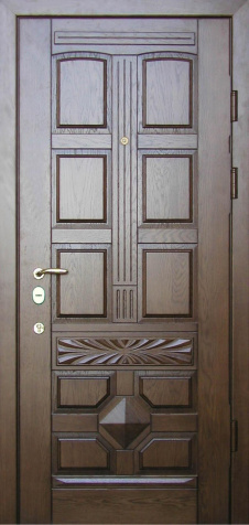Дизайнерская входная дверь в частный дом с отделкой под дерево и решеткой №17