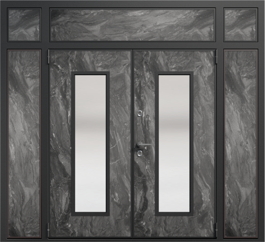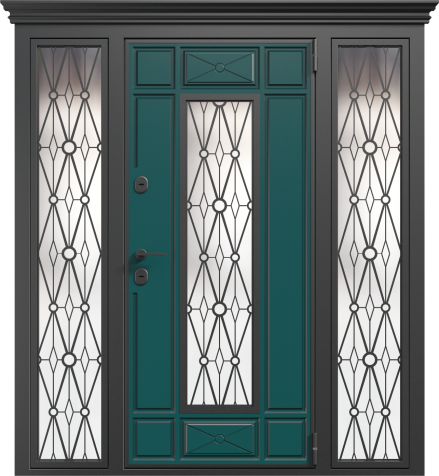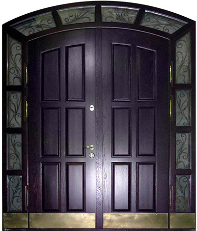 Если проём очень широкий, но не хочется устанавливать двустворчатую модель, используют комбинированные решения. Например, широкая входная дверь со стеклом или глухими боковыми вставками. По бокам основной створки могут быть узкие неподвижные панели: они уменьшают фактическую ширину открывающейся части и украшают вход. Такие вставки нередко содержат стеклопакет с декоративной решёткой или ковкой – подобный дизайн популярен для загородных коттеджей. Остекление выполняется из ударопрочного материала, чтобы дверь оставалась надёжной и безопасной.